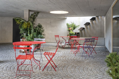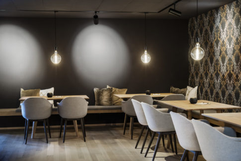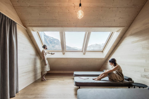 Die halbrunde Betonspange verbindet die beiden Häuser und gibt den Blick auf den Innenhof, die große Stube und den Empfang frei. Wichtig ist uns vor allem die Bregenzerwälder Gemütlichkeit. Natürliche Materialien, der Duft von heimischem Holz, flauschige Stoffe und die atmosphärische Beleuchtung vermitteln Geborgenheit. Ausgeklügelte Details überraschen mit ihren Besonderheiten und machen neugierig. Räume mit raffinierten Öffnungen und die schopfartigen Balkons verbinden die Apartments mit der eindrucksvollen Kulturlandschaft.