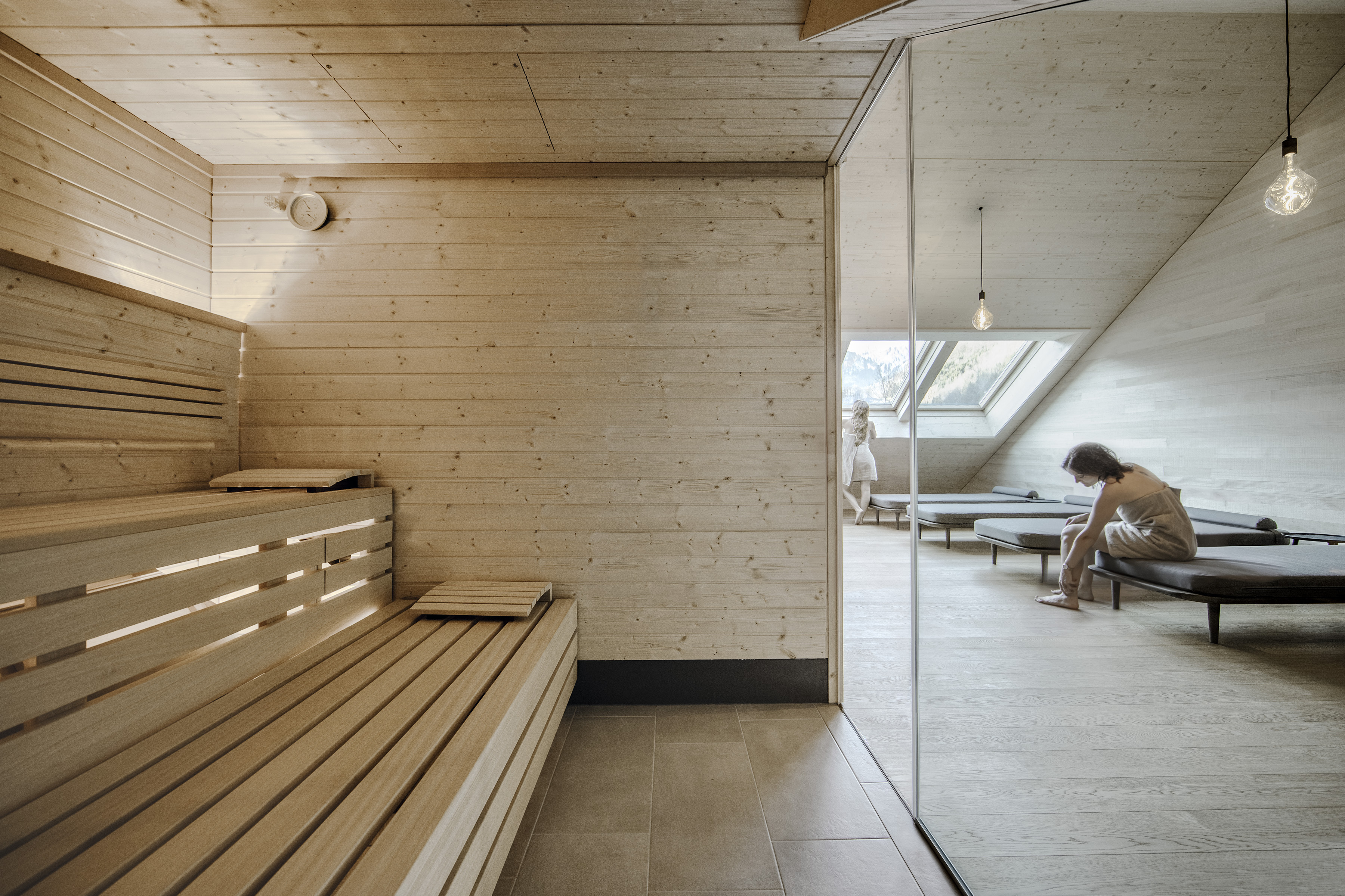 Entdecken Sie die perfekte Balance von Wärme und Ruhe in unserer finnischen Sauna. Zwischen den Sauna-Gängen ist der Ruheraum, der den Blick auf die majestätischen Berge, freigibt genau das Richtige – ein wahrer Boost für Ihr Immunsystem.