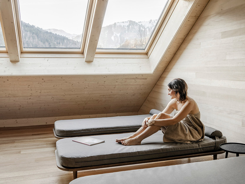 Im Ruheraum können Sie dem hektischen Alltag entfliehen. Entspannen Sie sich auf unseren feinen Liegen, bestaunen Sie die Berge oder tauchen Sie ein in Ihr Lieblingsbuch für eine erholsame Auszeit.